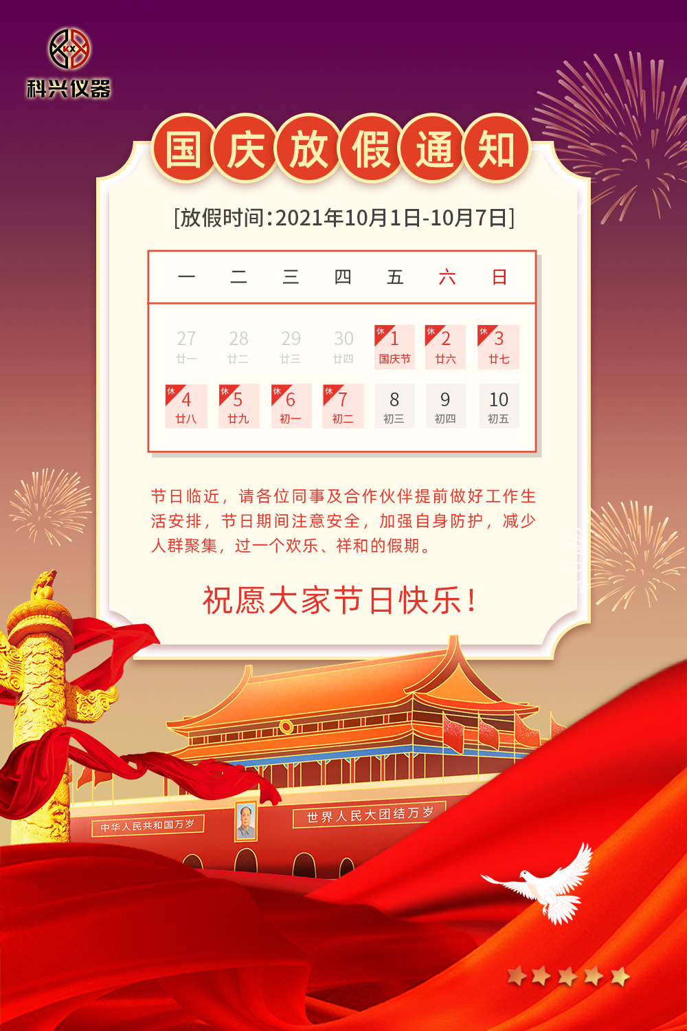 您好!感謝大家一直以來對上??婆d儀器的信任和支持,在國慶節(jié)來臨之際,我司決定于10月1日至10月7日放假7天,10月8日起恢復(fù)正常工作,給您帶來的不便敬請諒解,謝謝合作!