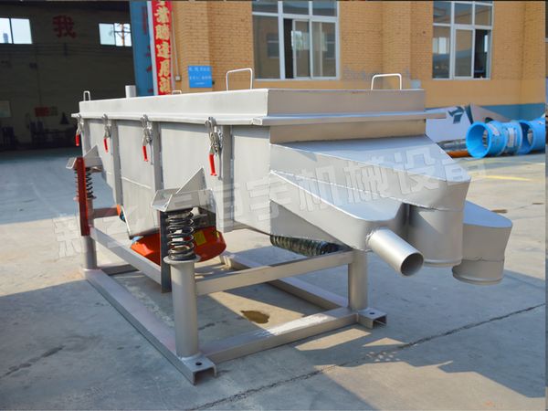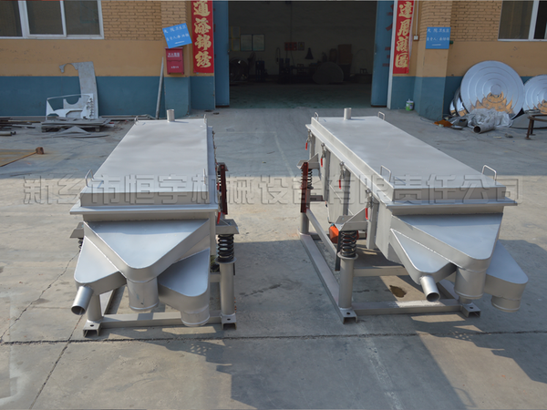 直線振動篩由篩箱、振動電機、減振系統及底架等組成。篩箱由槽體、上蓋、進料口、篩框、篩板(網)、襯網、出料口等組成。減振系統由阻尼彈簧和彈簧座等組成。